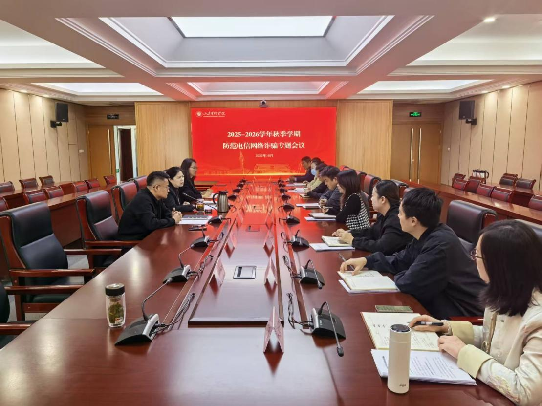 为应对当前校园电信网络诈骗案件频发的严峻形势,切实提高师生的防范电信网络诈骗能力,我校于10月14日组织召开2025-2026学年秋季学期防范电信网络诈骗专题会议。副校长王艺主持会议。