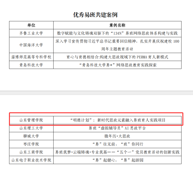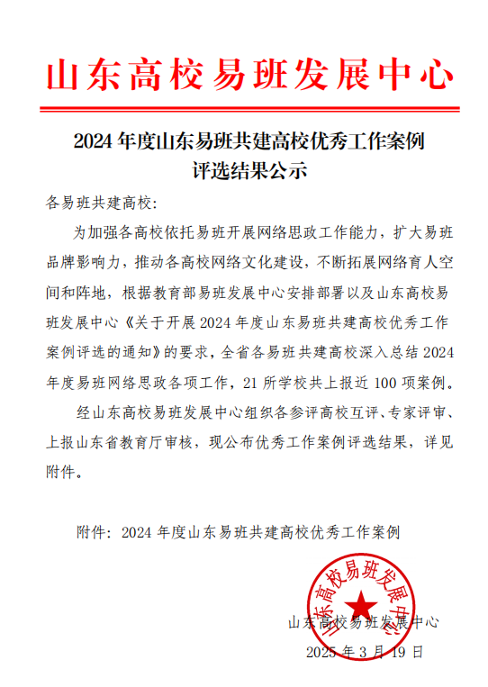 近期,在由教育部易班发展中心和山东高校易班发展中心共同开展的2024年度山东省易班共建高校先优评选工作中,我校所推出的“‘明德计划’新时代思政元素融入易班育人实践项目”荣获山东省“优秀易班共建案例”,辅导员田连叶荣获山东省“优秀易班辅导员”称号。